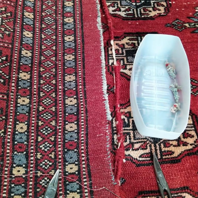 Restauration de tapis à Guérande, reprise des franges et bords de tapis au Pouliguen, nettoyage de tapis délicats (laine/soie) selon l’état.