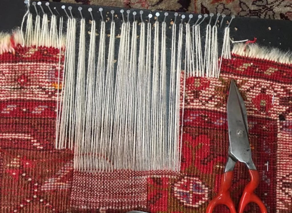 Restauration de tapis à Guérande, reprise des franges et bords de tapis au Pouliguen, nettoyage de tapis délicats (laine/soie) selon l’état.